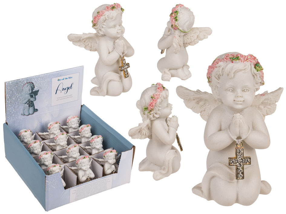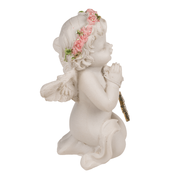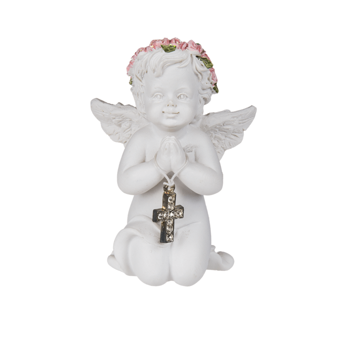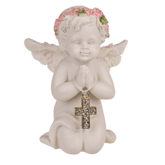 Delikatna i wzruszająca figurka anioła klęczącego z krzyżykiem to piękny symbol wiary, nadziei i opieki. Wykonana z wysokiej jakości polirezyny, zachwyca dbałością o detale – od subtelnych rysów twarzy po maleńkie kwiaty w różowej koronie. W dłoniach anioł trzyma krzyżyk wysadzany kryształkami, który dodaje blasku całej kompozycji. Idealna jako dekoracja do domu, prezent komunijny, pamiątka chrztu lub drobny upominek duchowy.