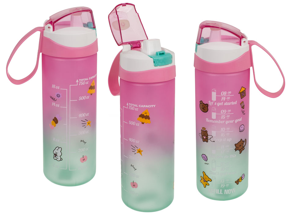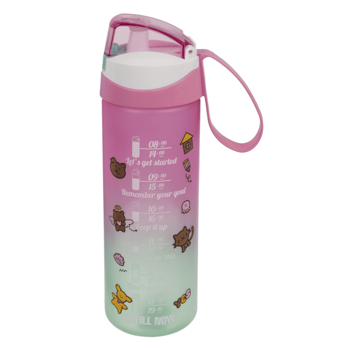 To nie jest zwykła butelka – to motywator w pastelowych kolorach, który pomaga dbać o nawodnienie przez cały dzień. Wyposażona w czytelny wskaźnik picia, podpowiada o której godzinie warto zrobić kolejny łyk, a urocze grafiki i łagodny gradient nadają jej wyjątkowo przyjemny charakter. Praktyczny pasek do noszenia, solidna konstrukcja i wygodne otwieranie jednym kliknięciem sprawiają, że idealnie sprawdza się w pracy, szkole, na treningu i w podróży.