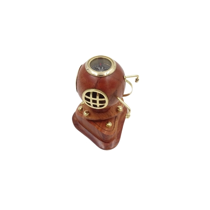 Exkluzivní hodiny s kompasem na potápěčské helmě Exkluzivní hodiny v podobě retro potápěčské helmy. Celý kus je vyroben ze dřeva a mosazi, takže se skvěle hodí do interiérů ve vintage, kabinetním a koloniálním stylu. Hodiny se budou skvěle vyjímat na krbové římse, psacím stole nebo na komodě. Velmi elegantní hodiny, které budou skvělým nápadem na dárek pro všechny obdivovatele námořních motivů. Součástí balení je navíc krásný kompas.