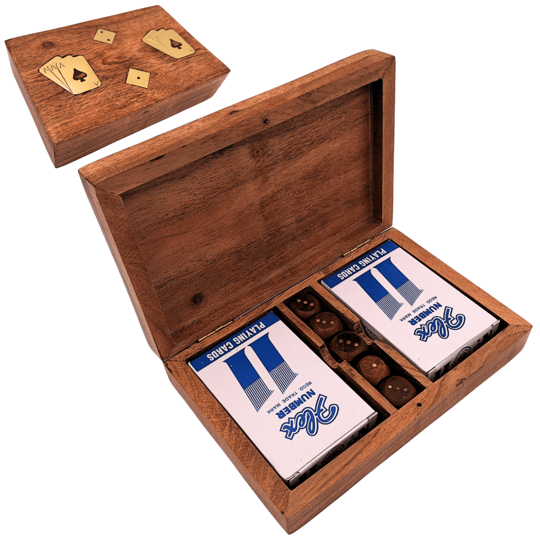 Dwie Talie Kart i Kości w Drewnianym PudełkuDwie Talie Kart i Kości w Drewnianym PudełkuDwie Talie Kart i Kości w Drewnianym Pudełku
