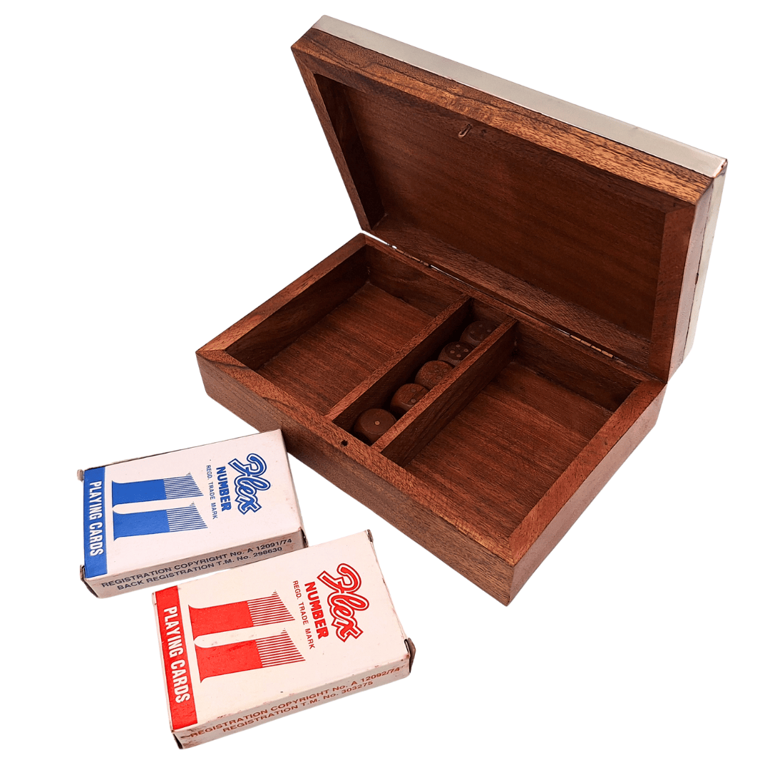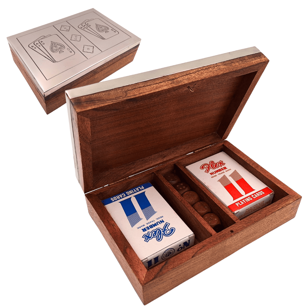Drewniane pudełko z dekoracyjnym, aluminiowym wiekiem pełni podwójną rolę – praktycznego etui oraz stylowego elementu wystroju. Po otwarciu wnętrze odsłania dwie talie kart oraz komplet kości do gry, gotowe do rozegrania partii kart, kości lub domowych turniejów. To zestaw, który nie krzyczy nowoczesnością, lecz spokojnie podkreśla klasę i charakter.