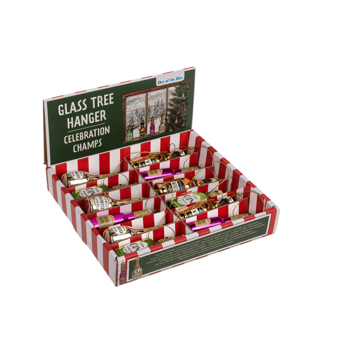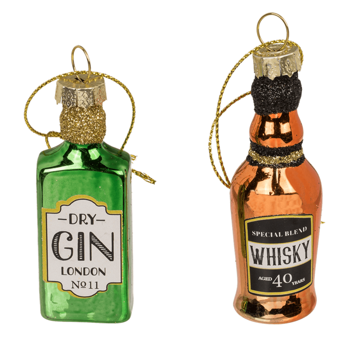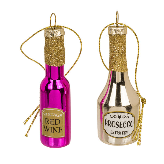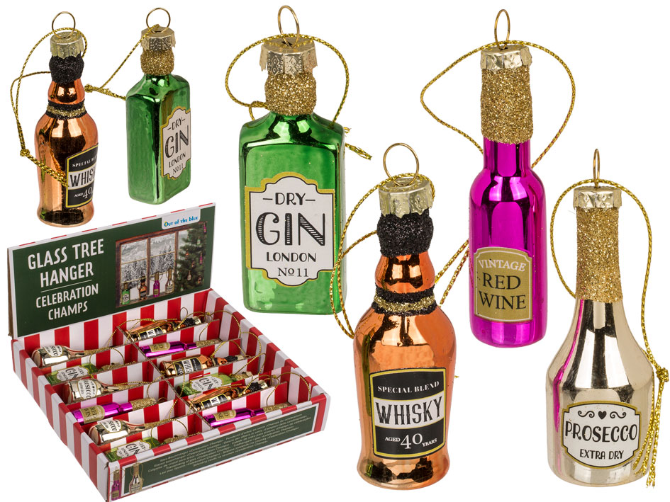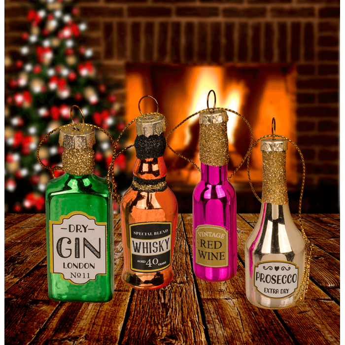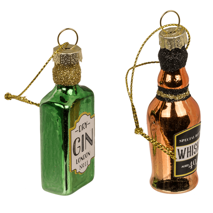 Az egyedi üveg karácsonyfadíszek palackok formájában modern és szórakoztató kiegészítői a karácsonyi dekorációnak. A készlet ismert szeszes italok - whisky, prosecco, gin és vörösbor - miniatűr palackjait tartalmazza, amelyek igazi ünnepi "ünnepi bajnokokként" csillognak a karácsonyfán. Mindegyik palack színes üvegből készült, fémes csillogású és csillogó kivitelben, így gyönyörűen visszatükrözi a karácsonyfa fényét. Fantáziadús dekoráció felnőtteknek, és tökéletes dísze egy karácsonyi bárnak vagy céges irodának.