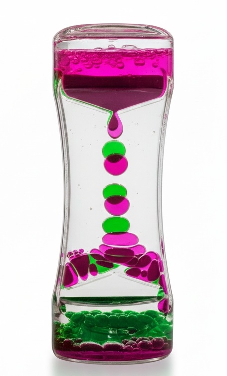 Przezroczysta obudowa pozwala w pełni obserwować płynny proces spływania żelu, który działa uspokajająco na wzrok i pomaga oderwać się od codziennego napięcia. Klepsydra doskonale sprawdzi się jako dekoracja biurka, element strefy relaksu, gadżet antystresowy w pracy, szkole lub gabinecie.