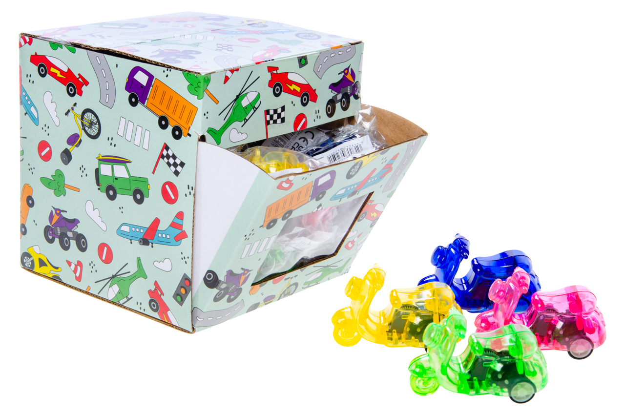 Niewielki, kolorowy skuter z mechanizmem napędowym to klasyczna zabawka, która zawsze cieszy najmłodszych. Wystarczy lekko pociągnąć do tyłu, by ruszył do przodu z energią! Przezroczysta, barwna obudowa pozwala zobaczyć mechanizm w środku, co dodaje uroku i ciekawości. Skuterki dostępne są w czterech intensywnych kolorach: zielonym, różowym, żółtym i niebieskim – idealne do sprzedaży impulsowej w sklepach, automatach lub jako drobne nagrody.