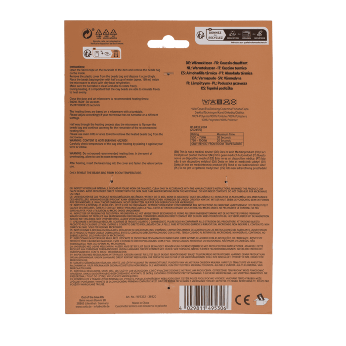 Ostrzeżenie! Kontroluj regularnie. Usuń jeśli jest zużyty lub uszkodzony! Czyść wyłącznie zgodnie z instrukcjami producenta. Ten produkt może powodować oparzenia. Unikaj długotrwałego bezpośredniego kontaktu ze skórą. Zachowaj ostrożność przy wyjmowaniu z kuchenki mikrofalowej. Nie spożywaj zawartości. Nie przegrzewaj. Tylko do użytku w kuchence mikrofalowej.