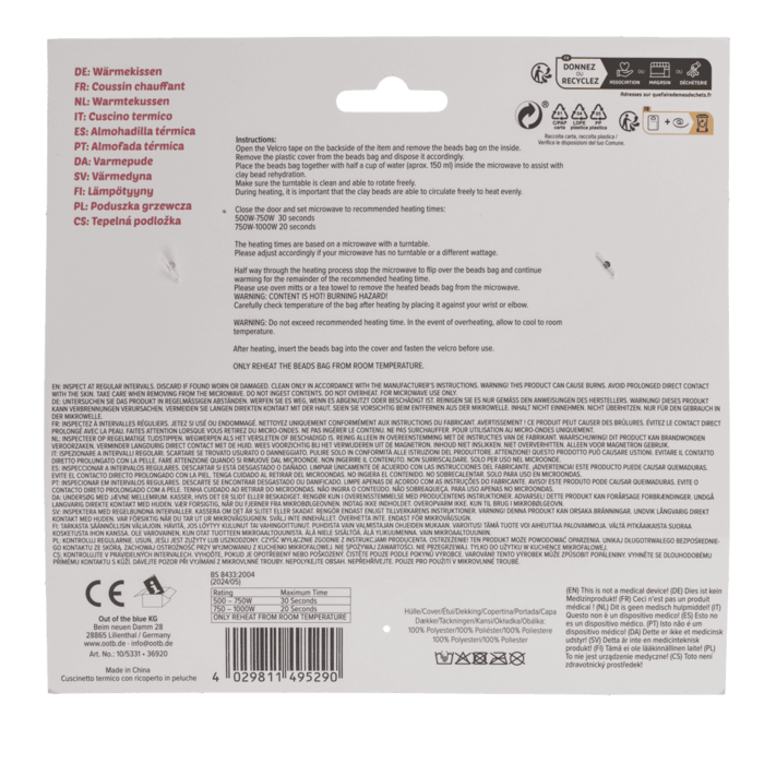 Ostrzeżenie! Kontroluj regularnie. Usuń jeśli jest zużyty lub uszkodzony! Czyść wyłącznie zgodnie z instrukcjami producenta. Ten produkt może powodować oparzenia. Unikaj długotrwałego bezpośredniego kontaktu ze skórą. Zachowaj ostrożność przy wyjmowaniu z kuchenki mikrofalowej. Nie spożywaj zawartości. Nie przegrzewaj. Tylko do użytku w kuchence mikrofalowej.