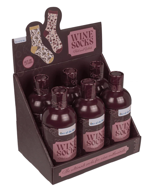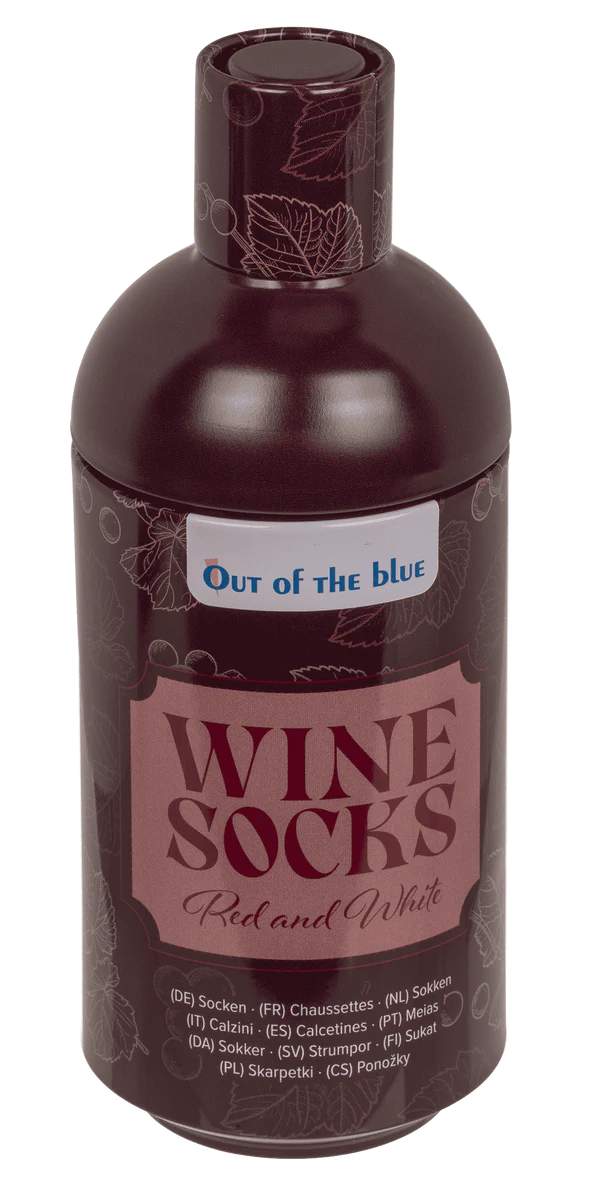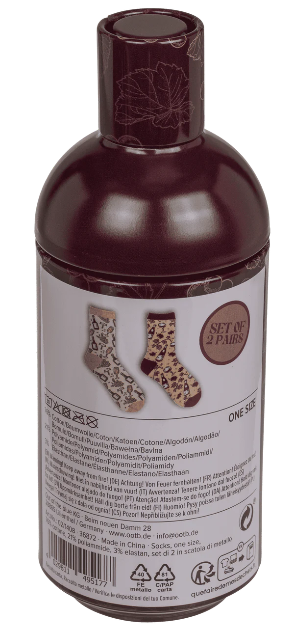 Te skarpetki z motywem wina to pomysłowy prezent dla osób, które cenią dobry smak – dosłownie i w przenośni. Subtelne grafiki butelek, kieliszków i winogron nadają im charakteru, a całość została zapakowana w metalowe opakowanie stylizowane na butelkę wina, które od razu robi wrażenie.