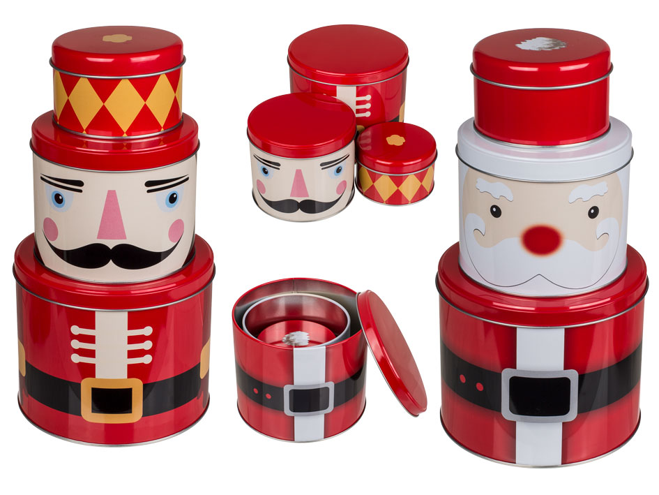 Wyjątkowy zestaw trzech świątecznych puszek metalowych w kształcie postaci Mikołaja i Dziadka do Orzechów to idealne połączenie praktyczności i uroku świąt. Każda puszka różni się rozmiarem, dzięki czemu można je ustawiać jedna w drugą, tworząc efektowną dekorację lub zestaw na ciasteczka, cukierki i drobiazgi. Wykonane z trwałego metalu, z pięknymi, kolorowymi nadrukami i połyskującym wykończeniem. Wysyłane jako mix dwóch wzorów.
